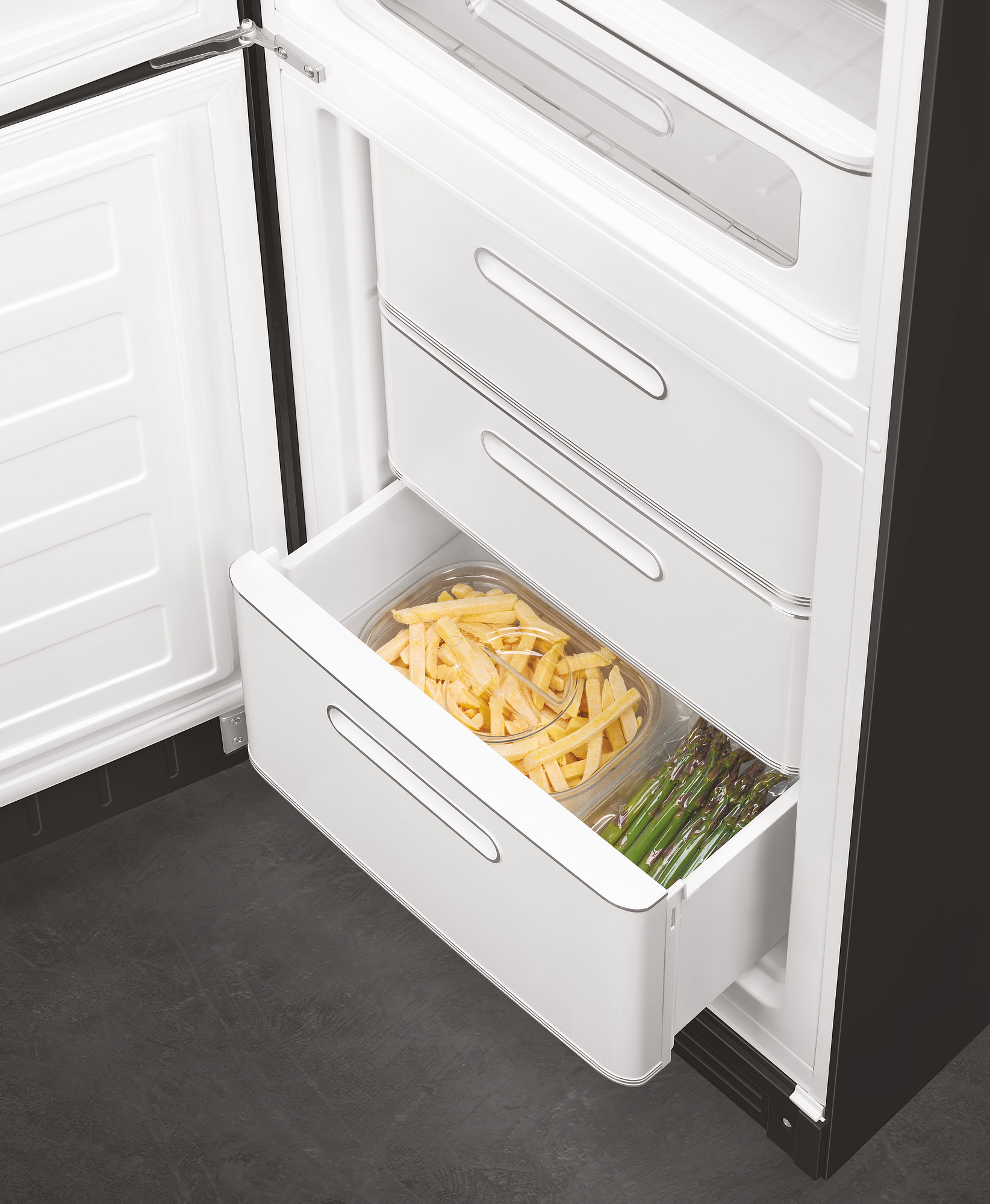 Kombineret køle-/fryseskab fra Smeg i sort med 3 fryseskuffer, No Frost og Multi Flow kølesystem. Læs hele beskrivelsen